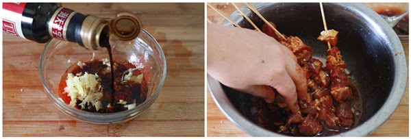 Trộn đều tỏi bằm với dầu hào, xì dầu, 10g bột thì là và chừng 8g bột ớt trong một bát nhỏ. Đem rưới đều lên từng xiên thịt. Dùng tay bóp thấu cho xiên thịt ngấm vị. Lấy phần hỗn hợp gia vị tiết ra sau khi ướp tiếp tục rưới lên mặt xiên thịt, lại bóp. Lặp lại thao tác này nhiều lần cho thịt ngấm đều. Ướp thịt chừng 1 giờ là được. Nhiều khi bận rộn, bạn có thể ướp thịt rồi để qua đêm trong ngăn mát tủ lạnh để tiết kiệm thời gian khi nấu chính.