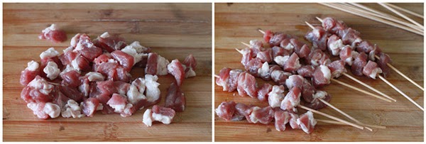 Ngâm que xiên trong nước nóng chừng nửa giờ, sau đó mới vớt ra và xiên thịt vào từng que xiên. Lưu ý, nếu miếng thịt quá dài, bạn xiên que nhọn qua đầu miếng thịt , sau đó xoắn tròn và xiên nốt đầu còn lại vào que tre cho gọn gàng nhé! Khi cuốn xong thì dùng tay nắn lại cho xiên thịt tròn đều. Mỗi que chỉ nên xiên chừng 6 – 7 miếng thôi nhé, các miếng thịt cũng hơi thưa trên que chứ đừng dính chặt nhau quá vì sẽ khiến cho thịt vừa lâu chín vừa không chín đều. Sau khi xiên, kê các xiên thịt lên miệng một cái bát to hoặc nồi nhỏ để tiện cho khâu tẩm ướp sau này.