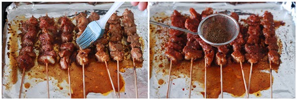 Xếp từng xiên thịt lên khay nướng có lót sẵn giấy nhôm. Dùng cọ quết một lớp dầu ăn lên các xiên thịt. Trộn nốt phần bột thì là, bột ớt, tiêu đen và xíu muối trong 1 bát nhỏ rồi rắc đều lên từng xiên thịt qua rây cho mịn.